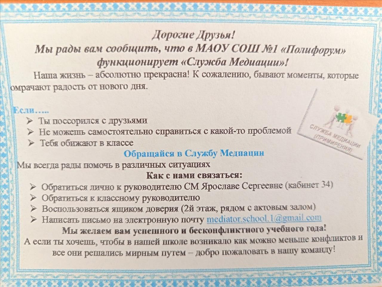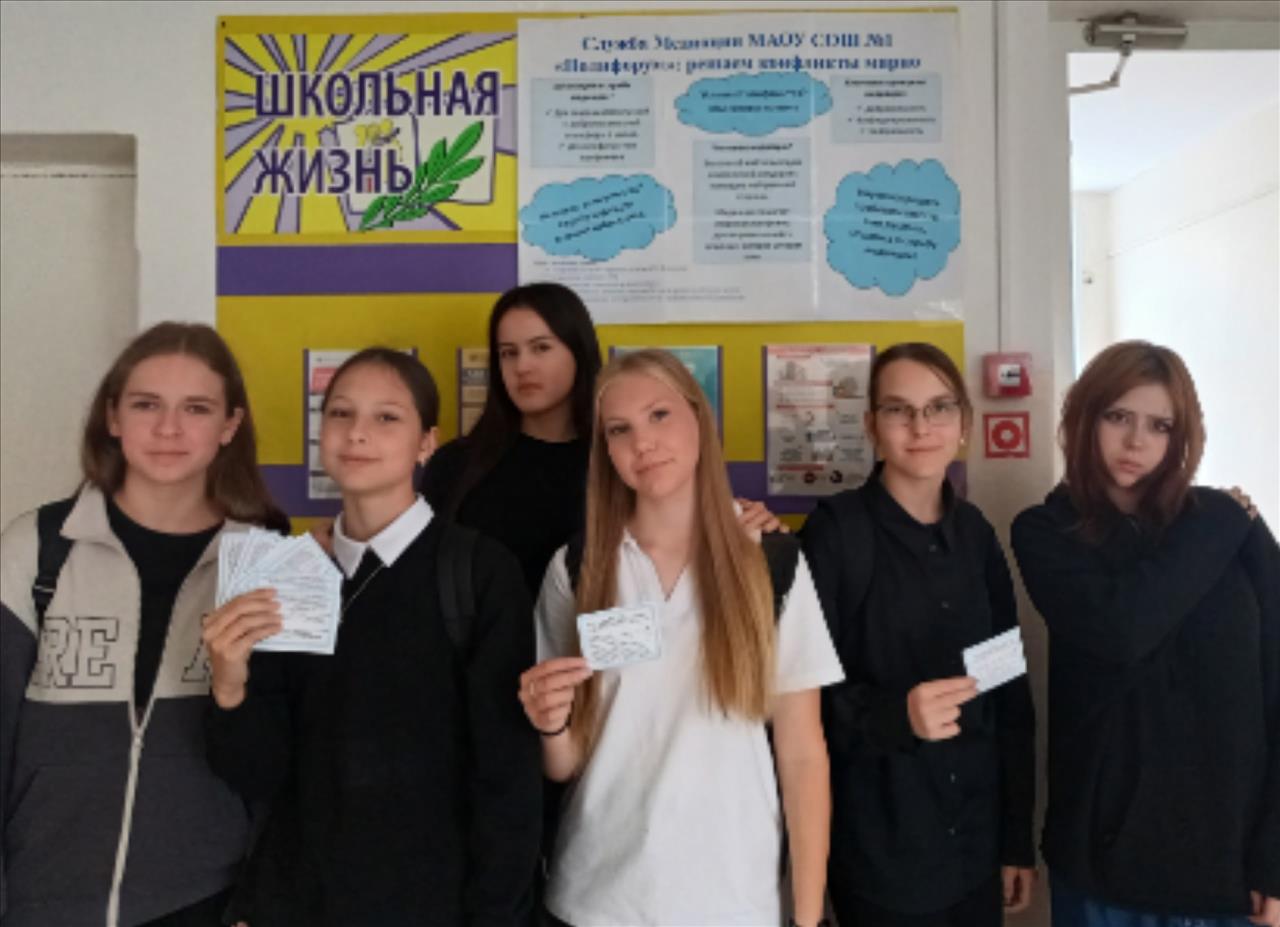 22 и 24 сентября обучающиеся 8Б класса напомнили всем о том, что в нашей школе функционирует Служба Медиации. Ребята раздали памятки с информацией о деятельности СМ и перечнем возможных способов обращения за помощью.