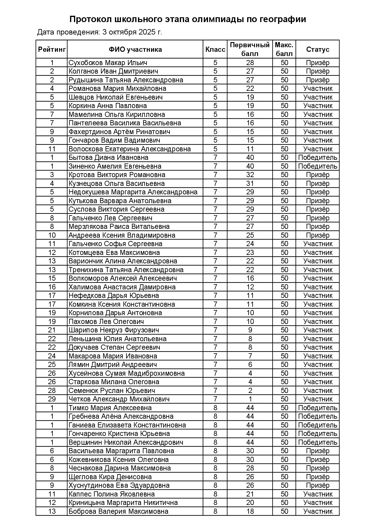 Результаты школьного этапа Всероссийской олимпиады школьников в 2025-2026 учебном году