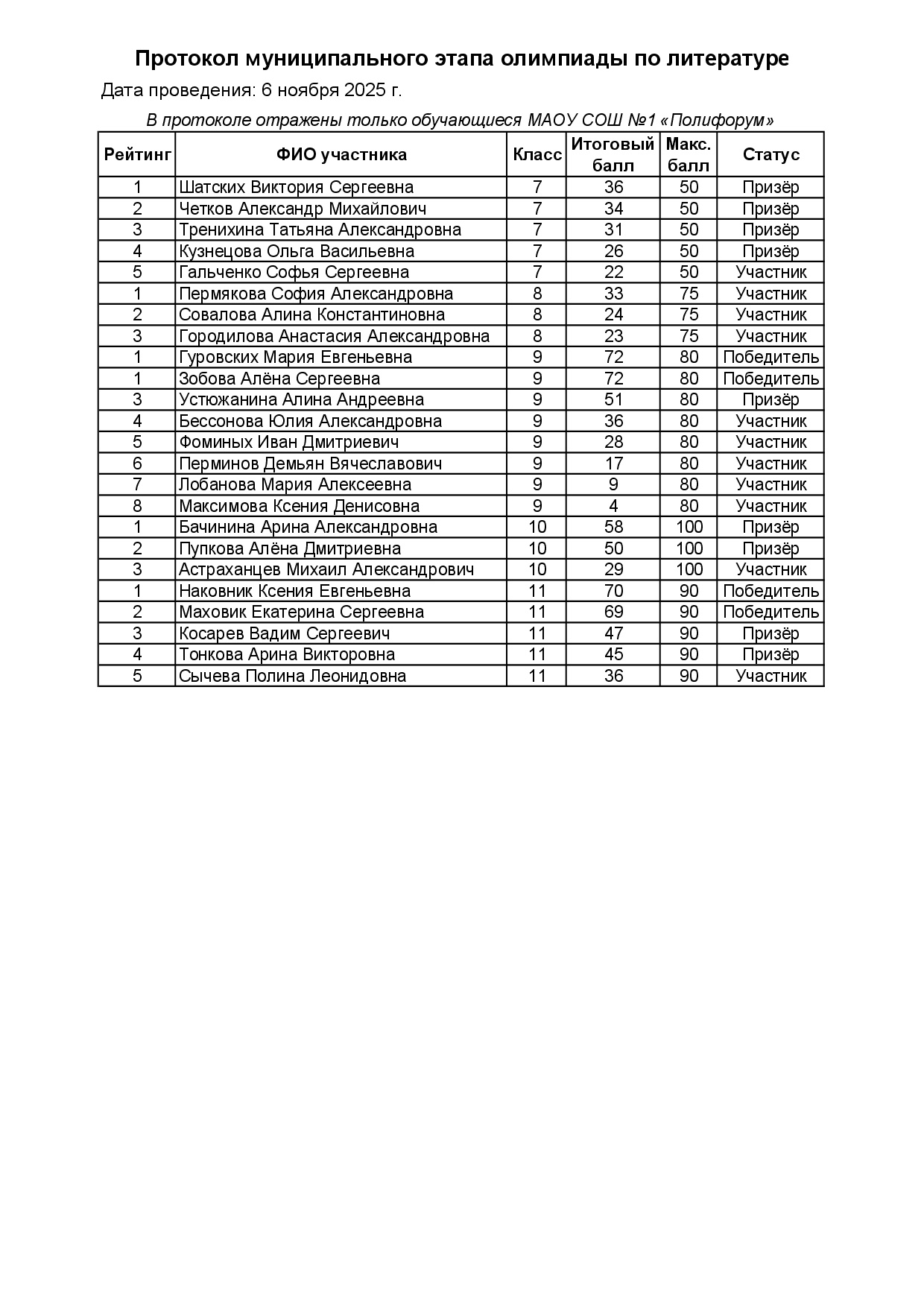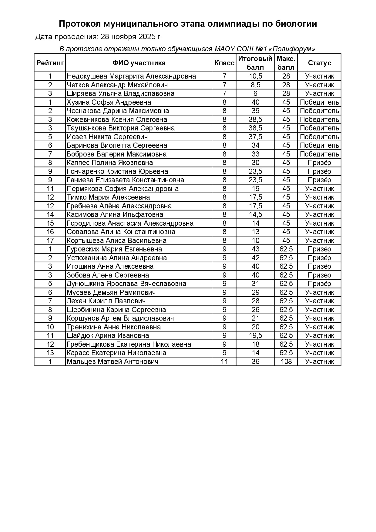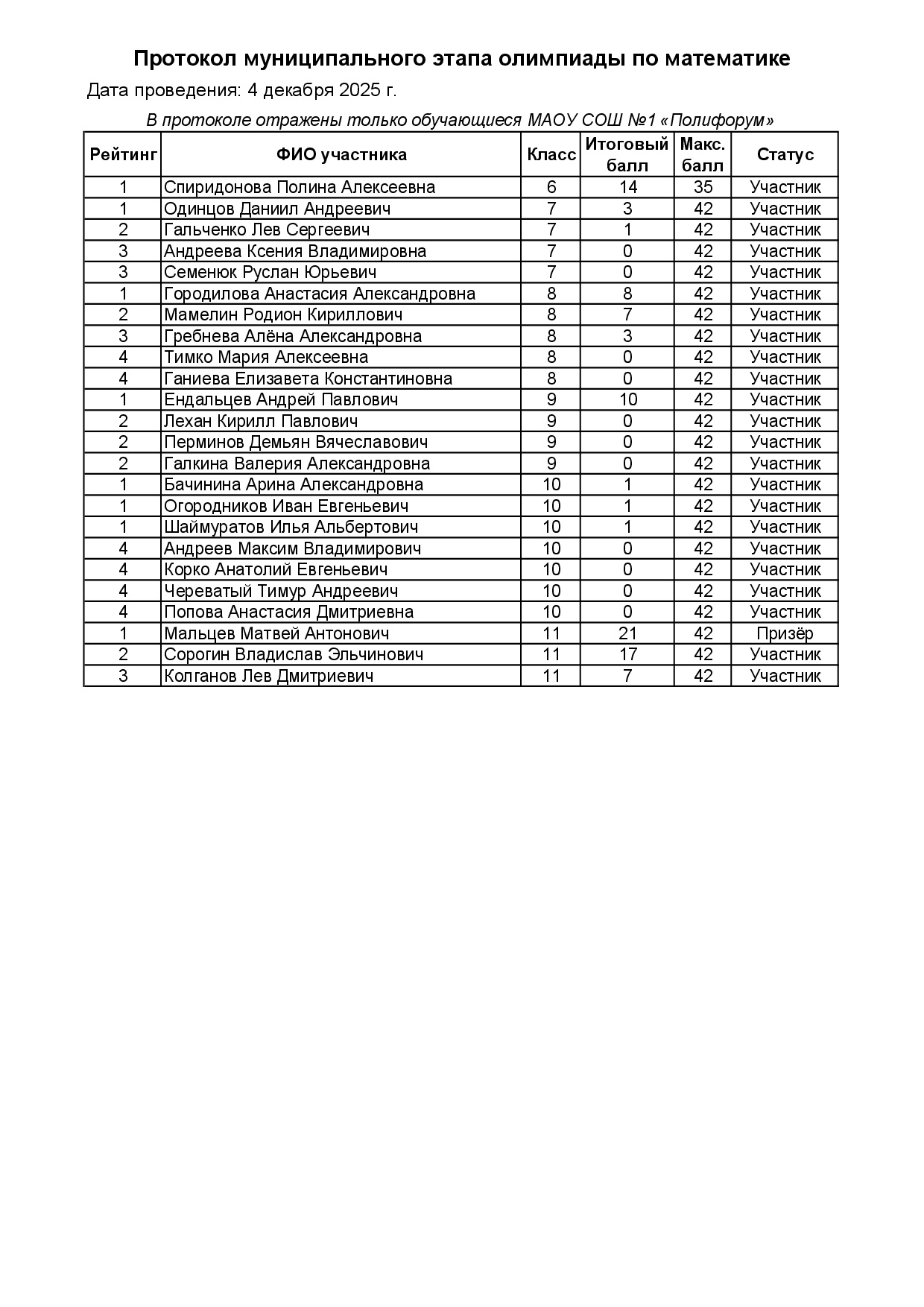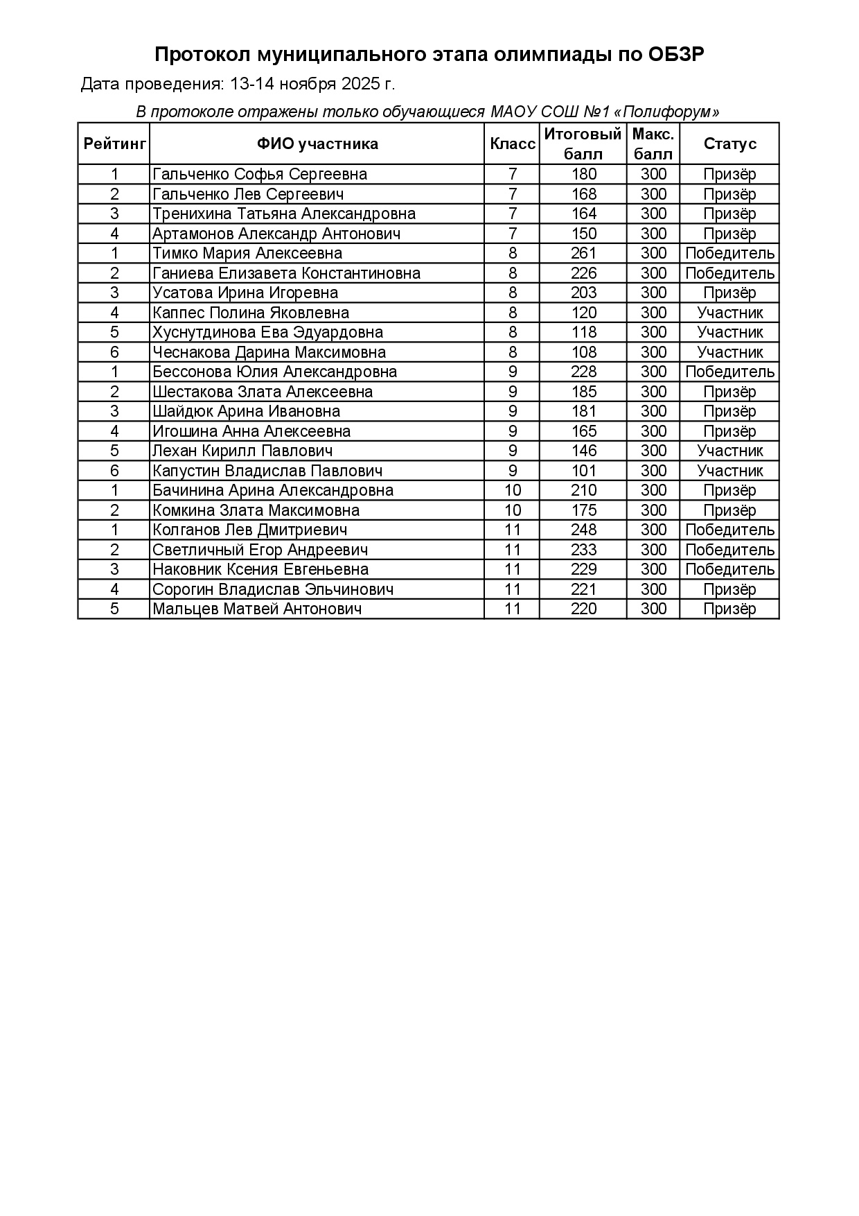 Результаты муниципального этапа Всероссийской олимпиады школьников в 2025-2026 учебном году