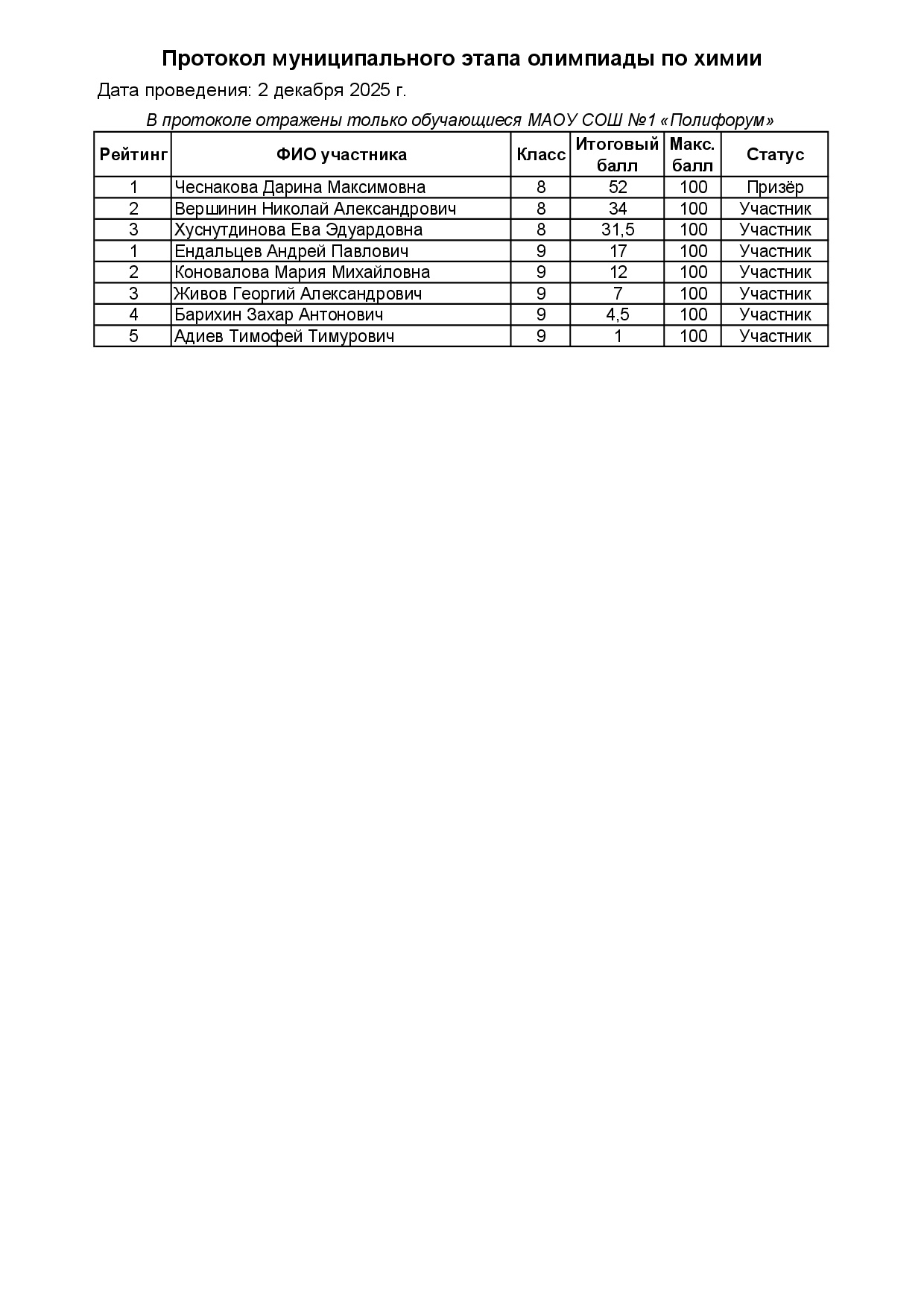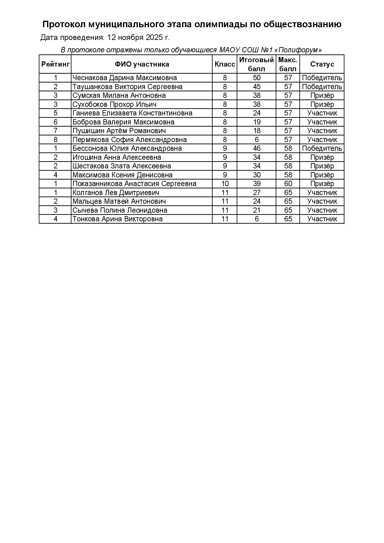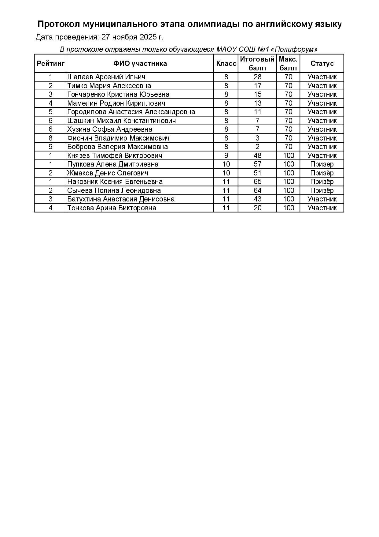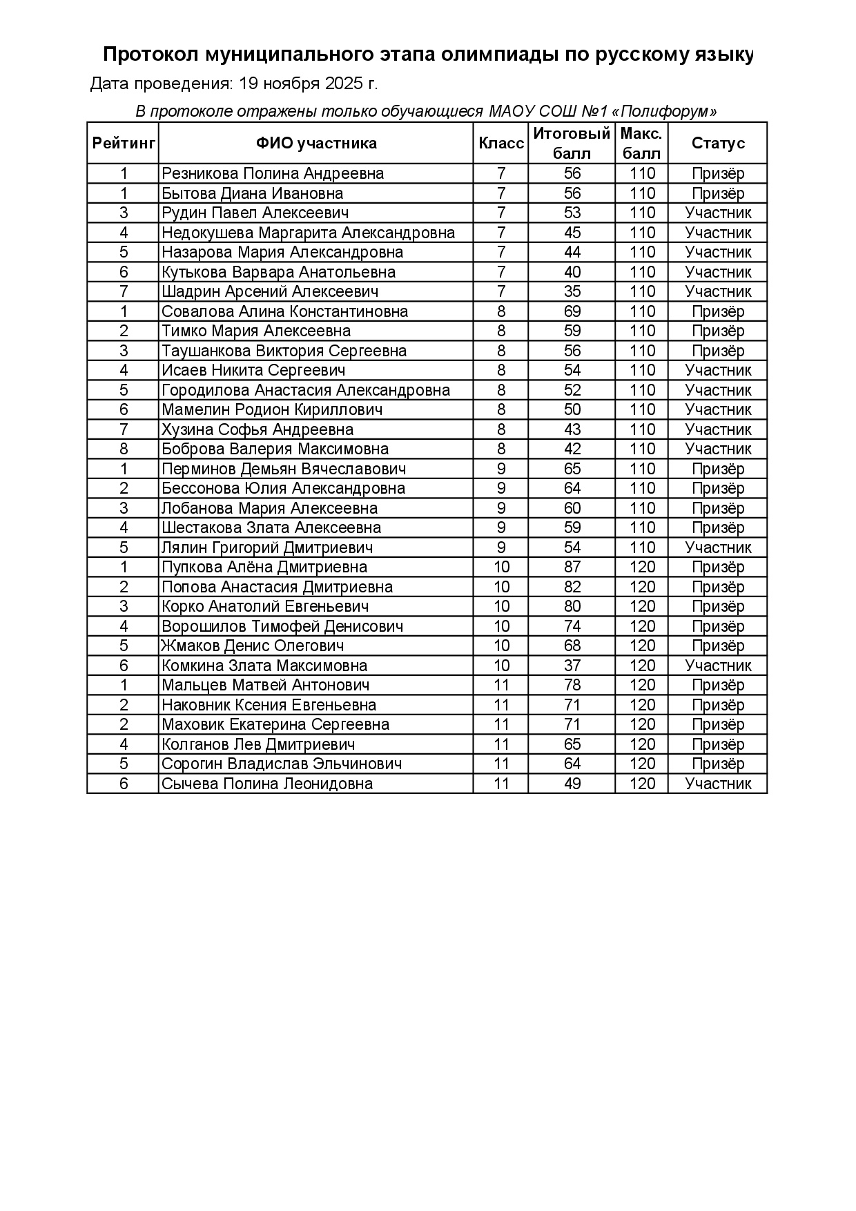 Результаты муниципального этапа Всероссийской олимпиады школьников в 2025-2026 учебном году